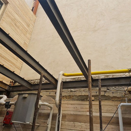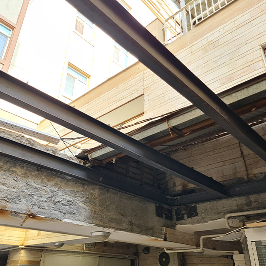 به علت نیاز کارفرما برای افزایش سطح اشتغال بنا و احداث فضاهای جدید (Void) مرکزی بیمارستان پوشش داده شد. اسکلت ساختمان از نوع ترکیبی در برخی قسمت‌ها فلزی و در برخی دیگر بتنی بود. برای این منظور پوشش Void که در بخش سازه بتنی قرار داشت با استفاده از روش کاشت بولت، نصب صفحه و اجرای تیرهای فلزی و با استفاده از سقف عرضه فولادی پوشش Void اجرا گردید. در برخی موارد ایجاد قطعات الحاقی و یا پوشش برخی از بازشوها و نورگیرها نه تنها باعث ایجاد بار اضافه در سازه نخواهد شد بلکه باعث از بین رفتن نامنظمی در پلان و یا در ارتفاع ساختمان خواهد شد که این موضوع در خصوص ساختمان بیمارستان مریم صدق می‌کرد. تصور کنید شما یک ساختمان دارای نامنظمی در پلان و یا ارتفاع طراحی کرده‌اید و بر اساس محاسبات این نامنظمی باعث ایجاد پیچش در طراحی سازه شده و شما برای کنترل آن می‌بایست بر اساس ضوابط آیین نامه تمهیداتی در نظر بگیرید. در این حالت المان‌های سازه نیاز به سختی بیشتری دارند بنابراین این سازه نسبت به حالت بدون در نظر گرفتن نامنظمی قطعاً بسیار قوی‌تر طراحی شده است. اگر عواملی که باعث ایجاد نامنظمی در ساختمان گردیده را بتوانید حذف کنید، قطعاً سازه شما شرایط بهتری خواهد داشت و یا به اصطلاح Over Design خواهد بود.