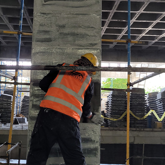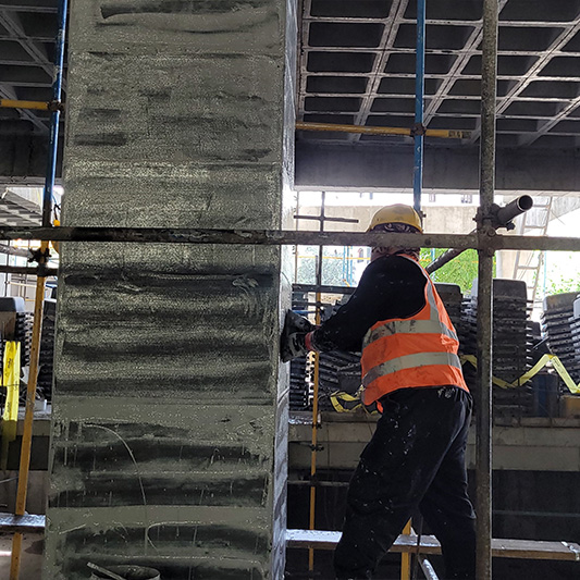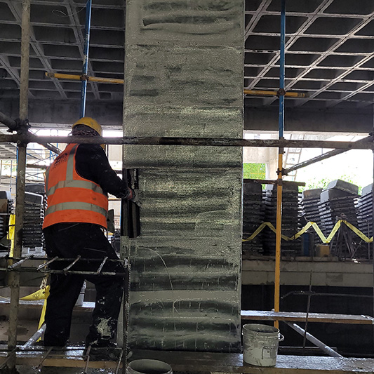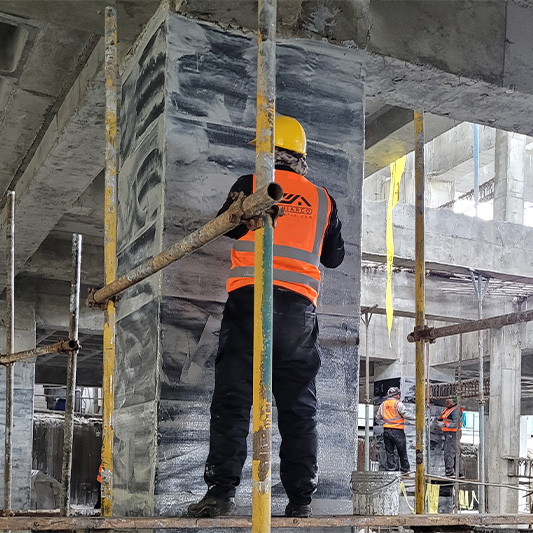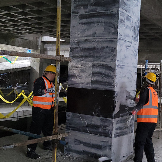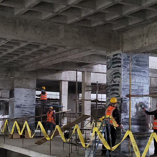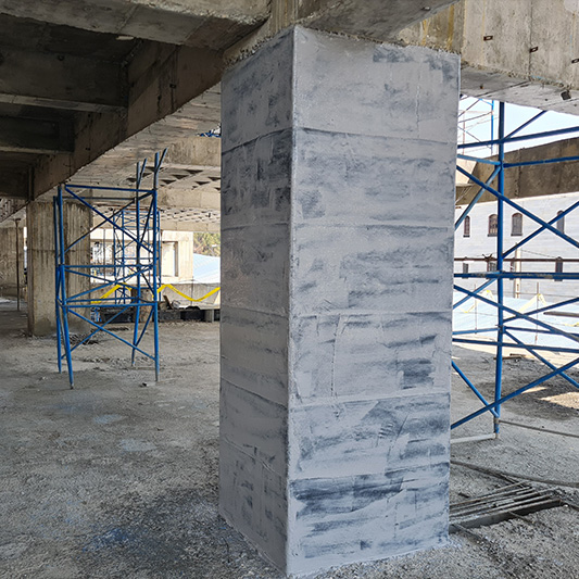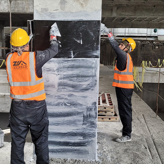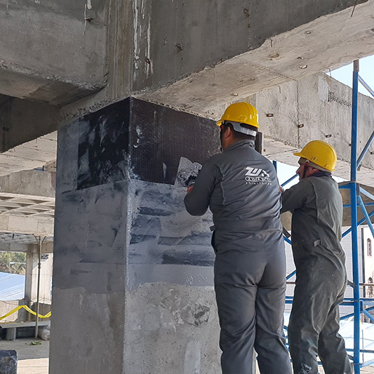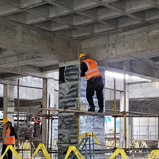 به علت عدم تطابق نتایج آزمایش بتن ستونها در برخی از طبقات، ساختمان نیاز به مقاوم سازی داشت. در طرح مقاومسازی برای تعدادی از ستونها اجرای FRP کربن در لایههای متفاوت پیش بینی شده بود که اجرای FRP کربن توسط این شرکت انجام شد و مصالح مورد استفاده (پارچه FRP و رزین اپوکسی) توسط دانشگاه تربیت مدرس آزمایش شد و نتایج با طرح مشاور مطابقت داشت. همچنین در اجرای CFRP هم تست (Pull Off) انجام شد که نتایج توسط مشاور پروژه تایید گردید. (زیربنای پروژه حدود ۳۰ هزار متر مربع)
